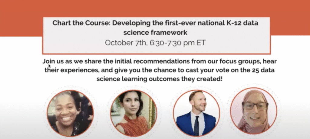 At the beginning of 2024, Data Science 4 Everyone organized 11 focus groups made up of K-12 educators, students, higher education leaders, industry professionals, and policymakers, working alongside national educator associations such as NCTM (math), NSTA (science), NCSS (social studies), and CSTA (computer science). The goal was to discuss, identify, and rank priority learning outcomes for data education that students should learn by high school graduation. As a member of the NCTM group, I was instrumental in helping lay the ground work for the first ever national K-12 framework for data science.